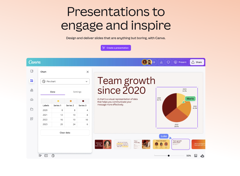 Looking for a presentation tool that makes designing feel quick and easy? Canva is another great Prezi alternative. It lets you build slides with ease, using a simple drag-and-drop interface and a huge library of templates. Whether you are creating a pitch deck. A webinar. Or a training session. Canva helps you put everything together in a way that looks polished without requiring design skills.