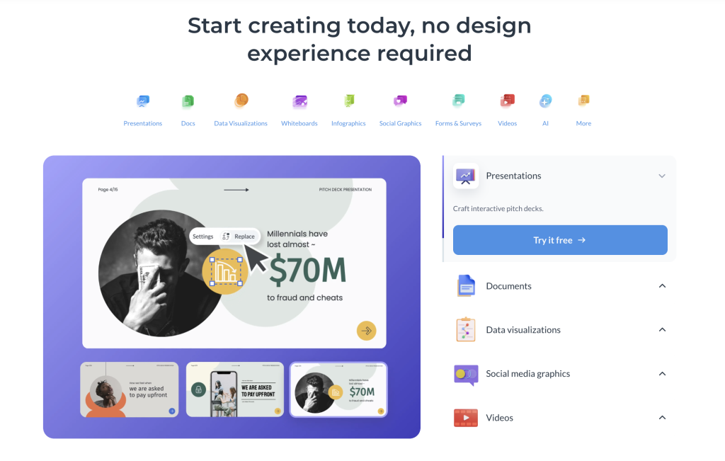 Looking to combine data? Visuals? Interactive elements? In a presentation? Visme is a solid Prezi alternative. With charts, maps, timelines, and clickable content built right in, your audience can explore the story at their own pace. It moves you beyond static slides into something more dynamic and engaging.