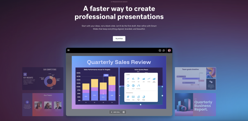 You’re looking for a smart presentation tool that adjust your slides automatically? Then Beautiful.ai is an easy choice. It uses smart templates that shift and resize as you work (which is great!). All you have to do is work on the content. And it takes care of the design details.