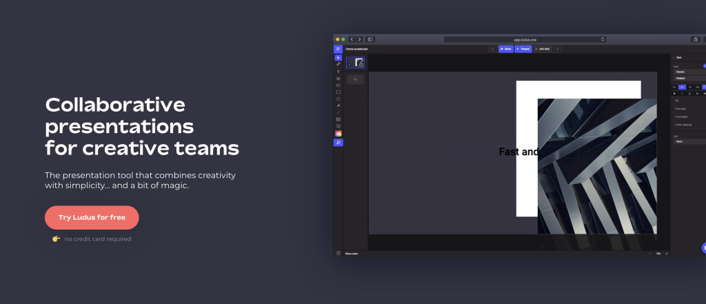 Love building things from scratch? But you want that flexibility and room to experiment? Ludus is a good Prezi alternative for this. It offers a freeform canvas where you can layer content. Add animations. The best part, you get to shape every slide exactly how you imagine it.