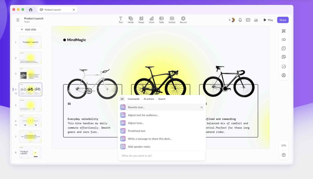 If you’re not looking to explore a high-level interactive presentation tool? Give it a go with Zoho. After all, it fits into the Zoho ecosystem.  It keeps things simple with a clean interface and the basics you need to create and share presentations.