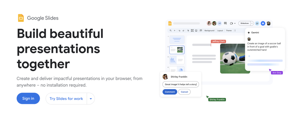 Want a no-fuss presentation tool that works well with your existing setup? Then Google Slides will deliver that just for you. t fits naturally into the Google Workspace environment, which makes it convenient for teams who already use Drive, Docs, and Meet.